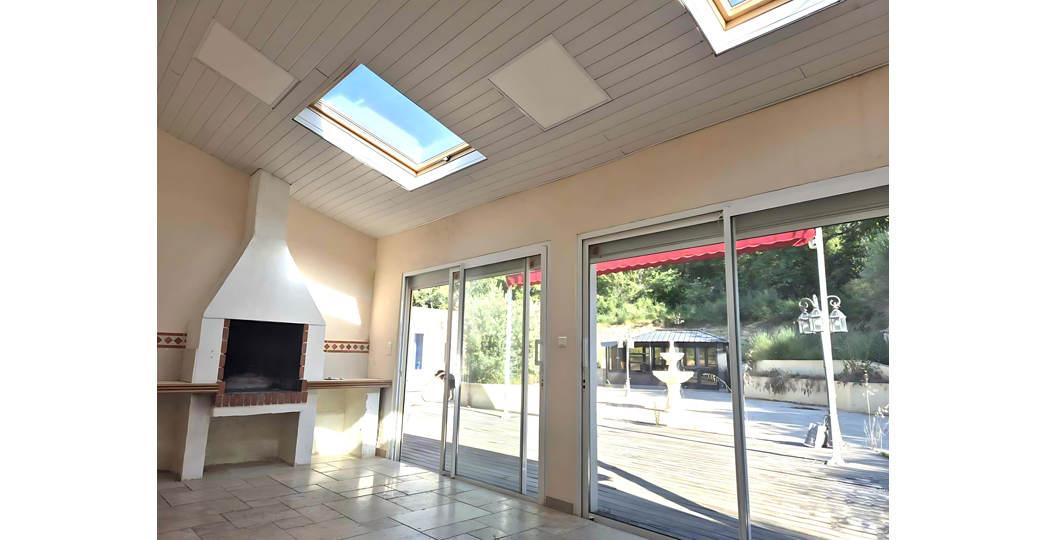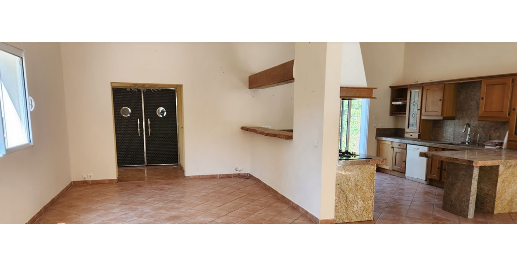 Salle à manger véranda avec four à pizza et accès à la terrasse + Salle de séjour avec cuisine ouverte, aménagée et équipée |